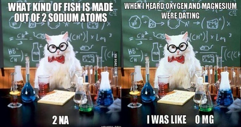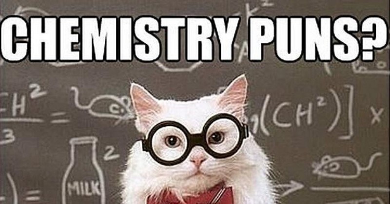 Chemistry cat meme. These puns are usually based on the names of chemical elements from the periodic table or various laws of science and physics. Chemistry Cat is a scientific looking cat that is used in memes about chemistry and science funnily enough. Mar 9 2016 - Funny Memes.